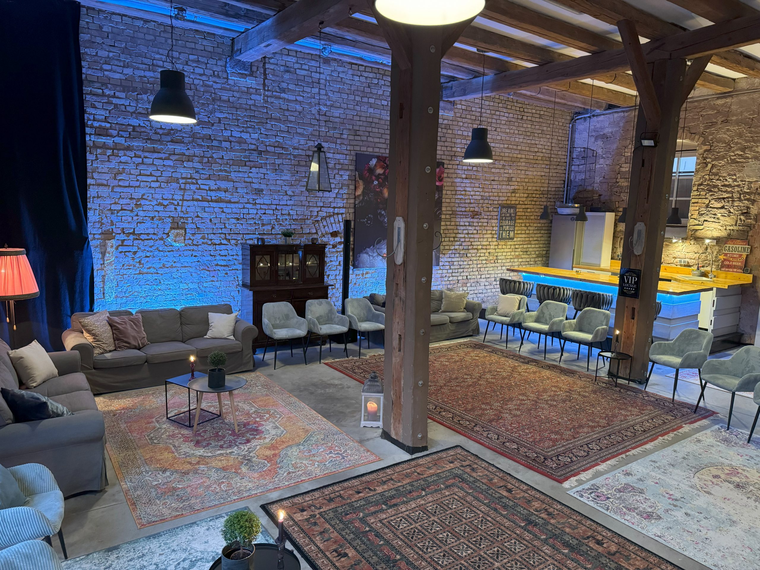 Die Kombination aus rustikalen Sandsteinwänden, stilvoller Barocktapete, Sichtestrich und stilvollem Mobiliar macht die Zehntscheune Ladenburg zu einem echten Unikat. Eine voll ausgestattete Küche, flexible Möblierung, eine Bar sowie ein optional zubuchbares Büro im Obergeschoss runden das Angebot ab. Der Raum ist barrierefrei zugänglich und somit auch für inklusive Veranstaltungen geeignet.